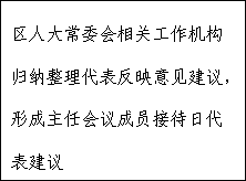 (三)接待日活动结束后,区人大常委会相关工作机构将代表反映的意见建议进行归纳整理,再报请接待人大代表的主任会议成员审定后,形成《代表接待日代表建议》作为闭会期间的建议交有关方面处理。